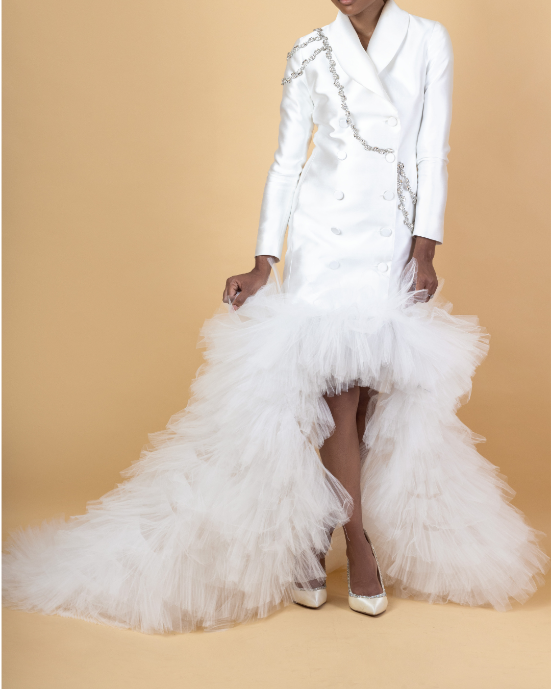 The Tux Ruffle Gown is a blazer-style dress with tulle ruffles. It also features: