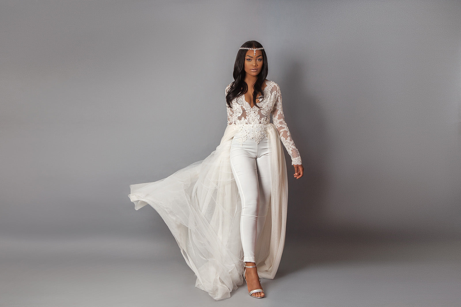 Bridal jumpsuit with bridal lace, fitted pant and tulle train